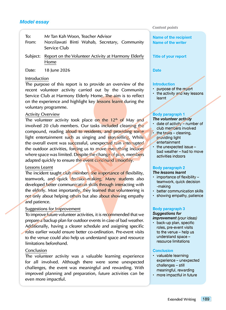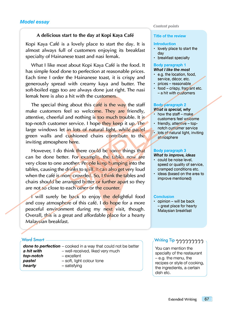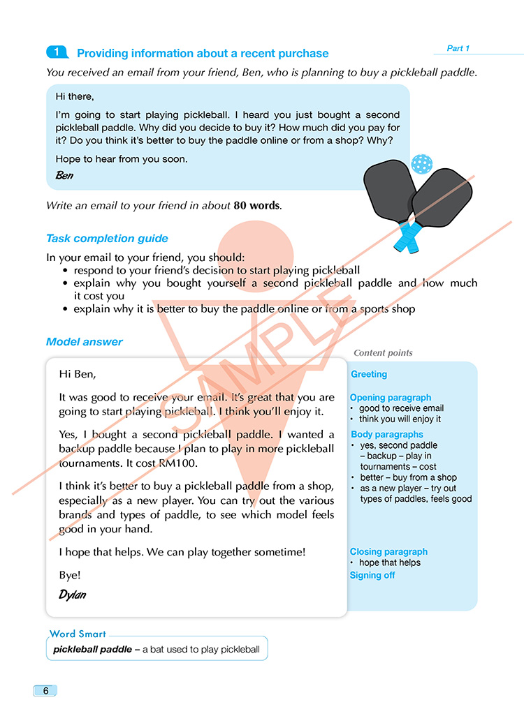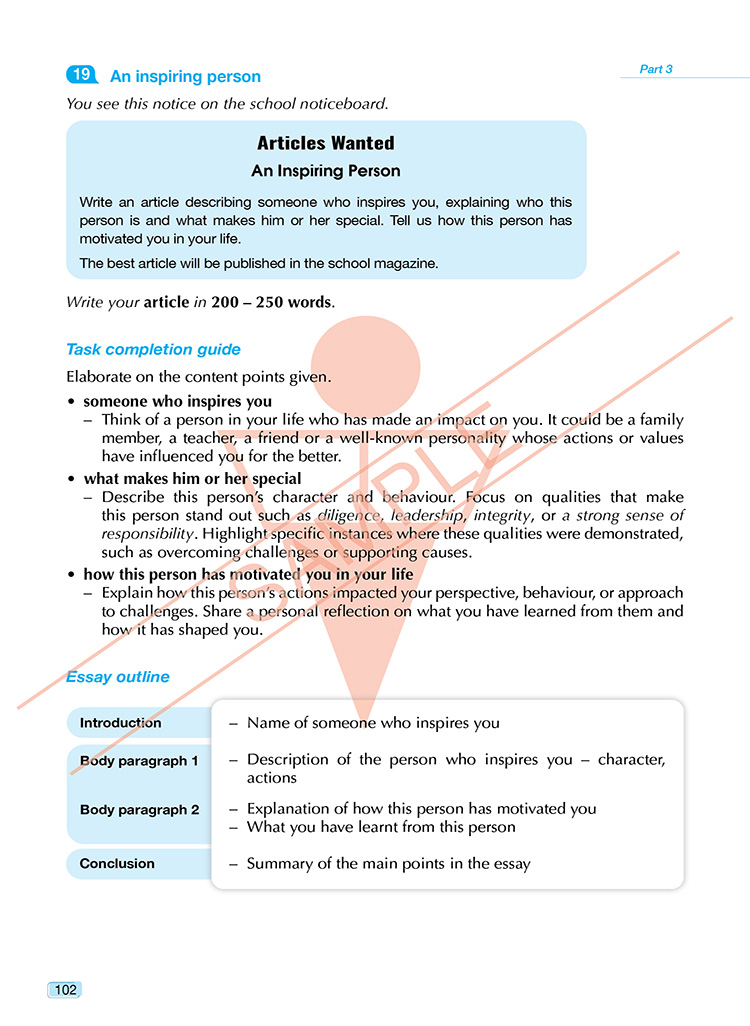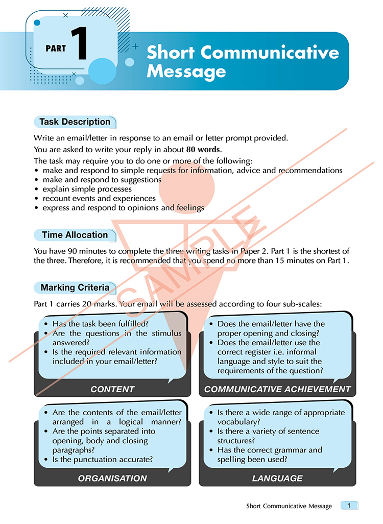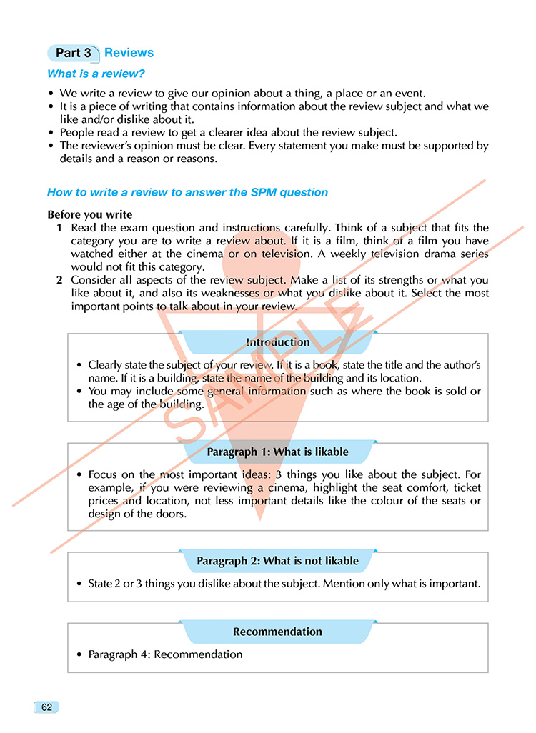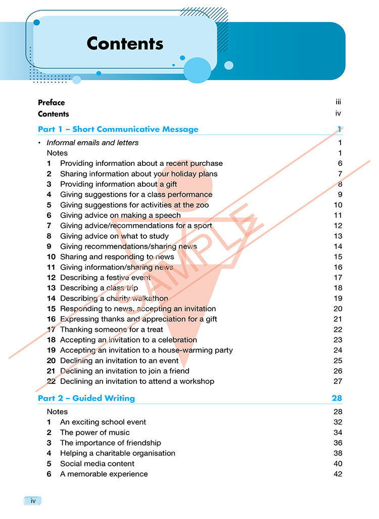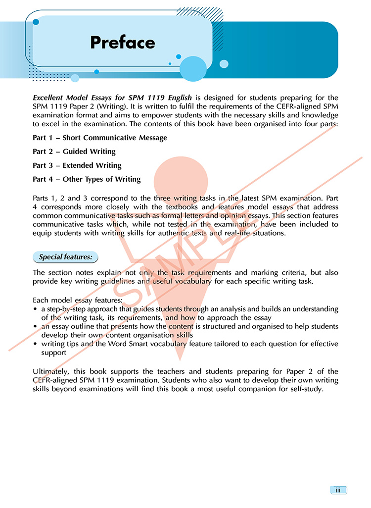 Excellent Model Essays for SPM 1119 English is designed to help students preparing for the CEFR-aligned SPM 1119 Paper 2 (Writing). This book takes an organised step-by-step approach that focuses on building students’ writing and task-based skills to empower them to excel in the SPM examination and beyond. Effective, targeted notes for the SPM-based sections provide key writing guidelines and useful vocabulary for the specific writing task. The model essays are supported by focused writing tips and topic-related vocabulary.